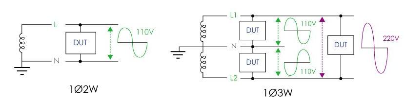 电源一般交流单相系统常见于生活周遭,属于生活用电,使用的电压较低,例如: 110V或220V。交流单相电力系统又可分成两种形式,如下图所示,单相二线式:一条火线L/一条中性线N,以及单相三线式:两条火线L1和L2/一条中性线N,单相三线式的电力系统接L1–L2输出的电压会是L1–N或L2–N电压的2倍,可应用于单相大功率的负载产品,例如:家用空调、烤箱、电热水器等。具有单相三线的电力系统配置的地区有:台湾(110V/220V)、日本(100V/200V)和美国/加拿大(120V/240V)。用户一般需要特别购买单相三线输出的电源才能模拟相应的电力配置,但现在透过AFV+系列的三相机种,并选配相间角功能设定,即可轻松实现单相三线的电源模拟。