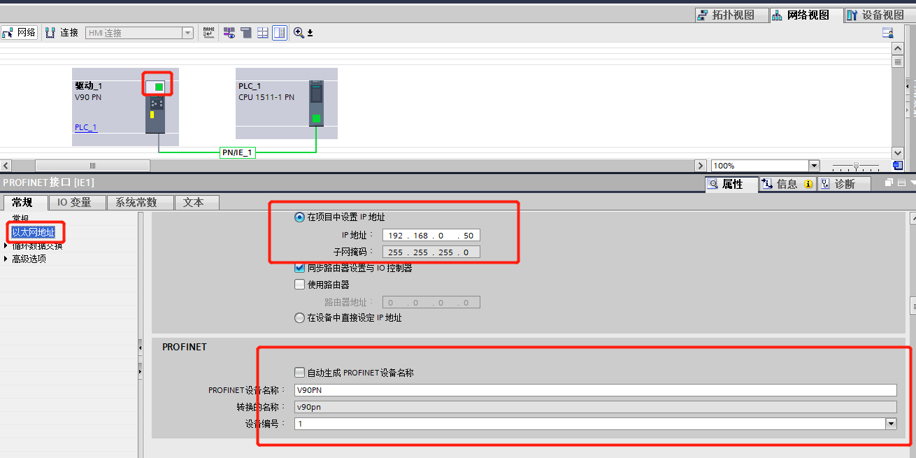 5、建立 V90 PN 与 PLC 的网络连接,并分别设置 S7-1500 及 V90 PN 的 IP 地址及设备名称。