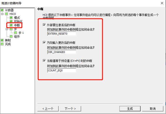 4)当前值等于预置值时产生的中断,通过向导,可以在该中断的服务程序中重新设置高速计数器的参数,如预置值、当前值。一个这样的过程称为‘一步‘。