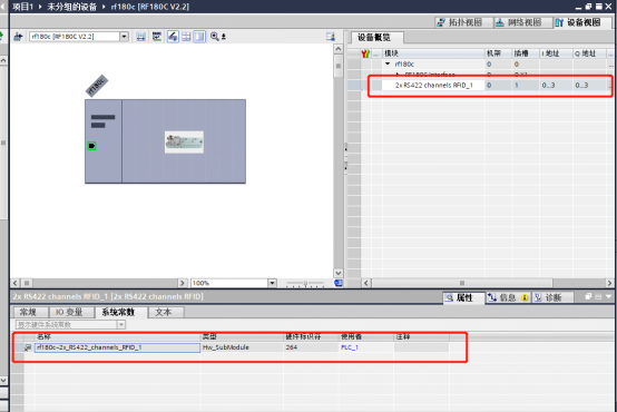 双击 RF180C 进入 RF180C 设备视图,在设备视图右侧的设备概览中选择 2xRS422 channels RFID_1,其输入、输出地址是 RFID 连接参数的 LADDR,本例为 256。2xRS422 channels RFID_1 模块“属性/常规”中的硬件标识,是 RFID 连接参数的 HW_ID,本例为 264(注意,输入和输出起始地址必须相同)。