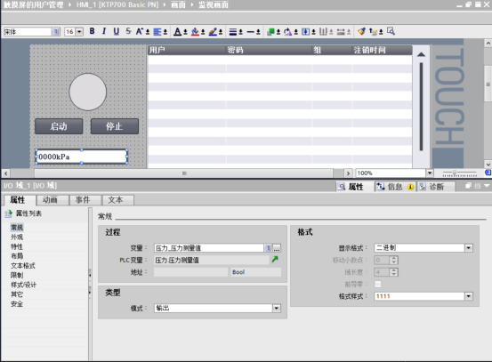 点击 PLC的数据块“压力”,从详细视图中将变量“触摸屏启动”分别拖放到启动按钮的按下(置位位)和释放(复位位)事件中。将变量“触摸屏停止”分别拖放到停止按钮的按下(置位位)和释放(复位位)事件中。将变量“压力测量值”拖放到测量压力下,从“常规”中选择模式为输出域,将移动小数点设为1111,从属性下的“外观”中设置单位为“kPa”。